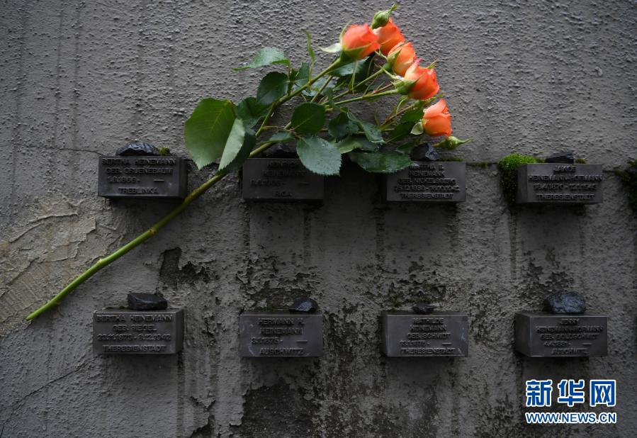 1月27日,德国法兰克福老犹太公墓外的“姓名墙”上摆放着一束鲜花。