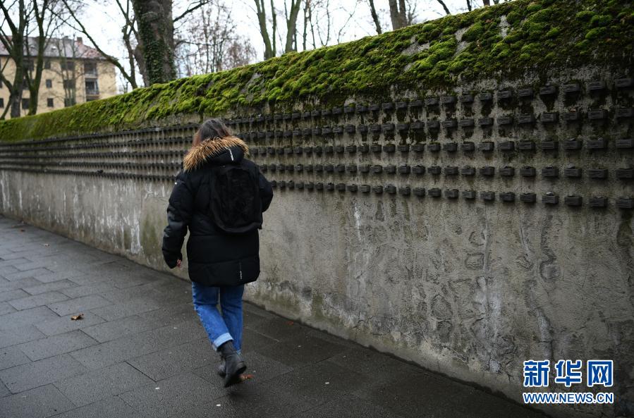 1月27日,一名行人从德国法兰克福老犹太公墓外的“姓名墙”旁经过。