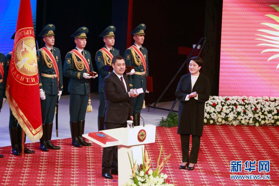 1月28日,扎帕罗夫(中)在吉尔吉斯斯坦首都比什凯克向人们展示总统工作证。新华社发(罗曼摄)