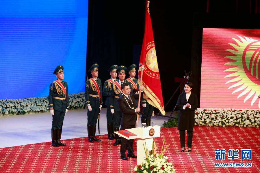 1月28日,扎帕罗夫(中)在吉尔吉斯斯坦首都比什凯克举起象征总统权力的旗帜。新华社发(罗曼摄)