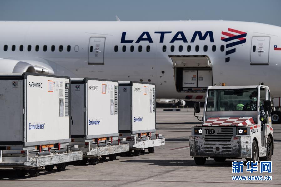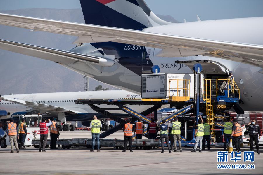 1月28日,在智利圣地亚哥国际机场,工作人员从飞机上卸下装有中国新冠疫苗的温控集装箱。新华社发(豪尔赫·比列加斯摄)