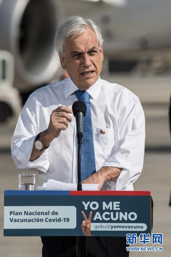 1月28日,在智利圣地亚哥国际机场,智利总统皮涅拉迎接首批中国新冠疫苗并发表讲话。新华社发(豪尔赫·比列加斯摄)