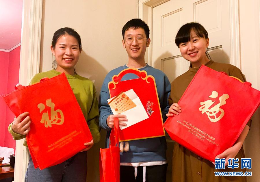 1月22日,霍夫斯特拉大学中国留学生张莹莹、牛亨通和李真真(从左到右)在美国纽约展示“春节包”。新华社发(中国驻纽约总领事馆供图)