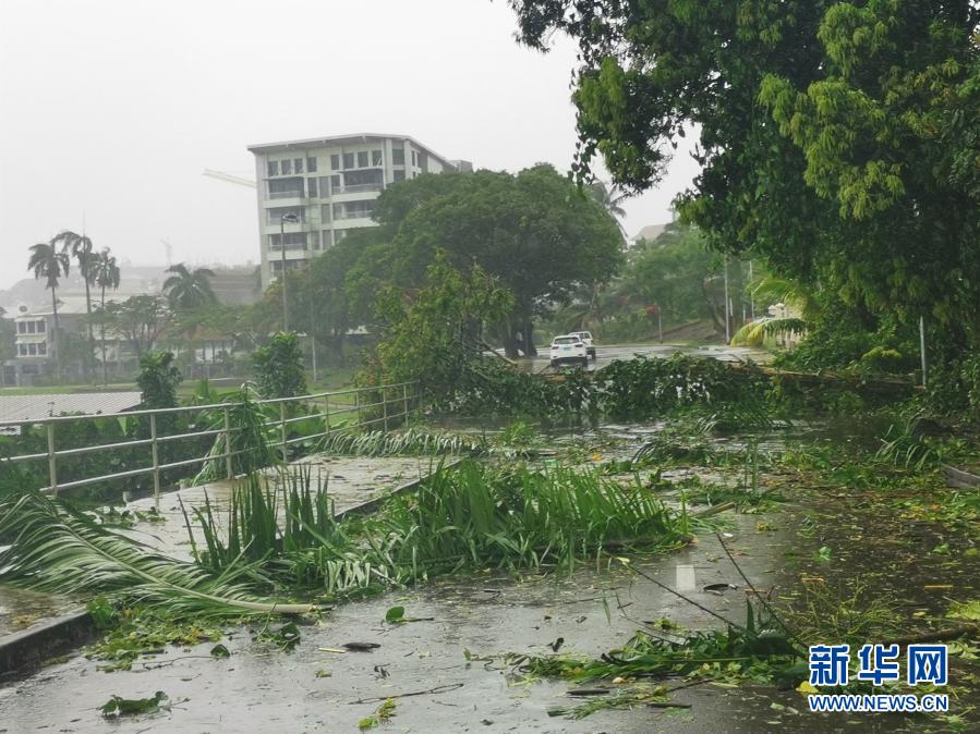 这是1月31日在斐济苏瓦街头拍摄的被吹倒的树枝。