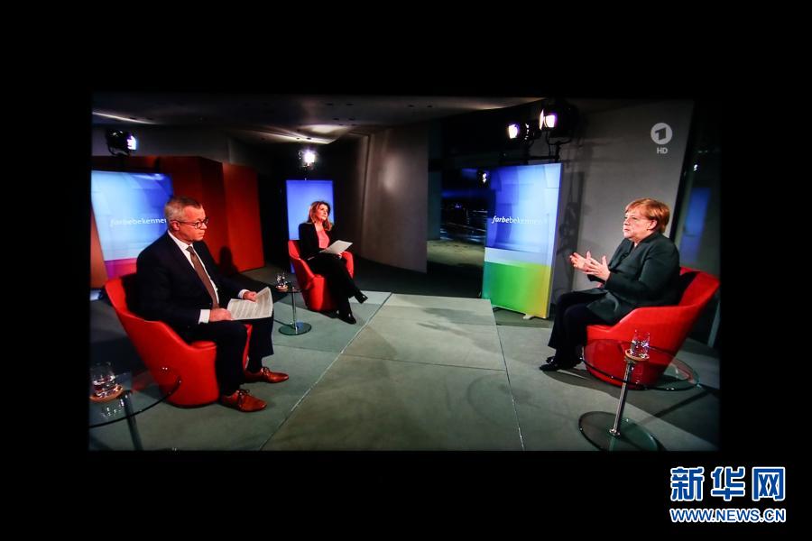 这是2月2日在德国首都柏林拍摄的德国总理默克尔参加德国电视一台一档访谈节目的视频画面。新华社记者 单宇琦 摄