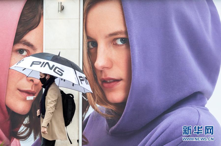 2月3日,一名戴着口罩的男子打伞走在英国伦敦街头。