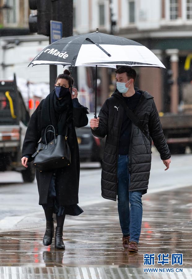 2月3日,戴着口罩的人们打伞走在英国伦敦街头。