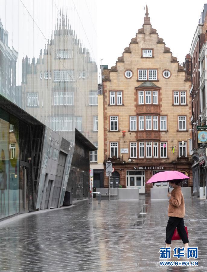 2月3日,一名戴着口罩的女子打伞走在英国伦敦街头。