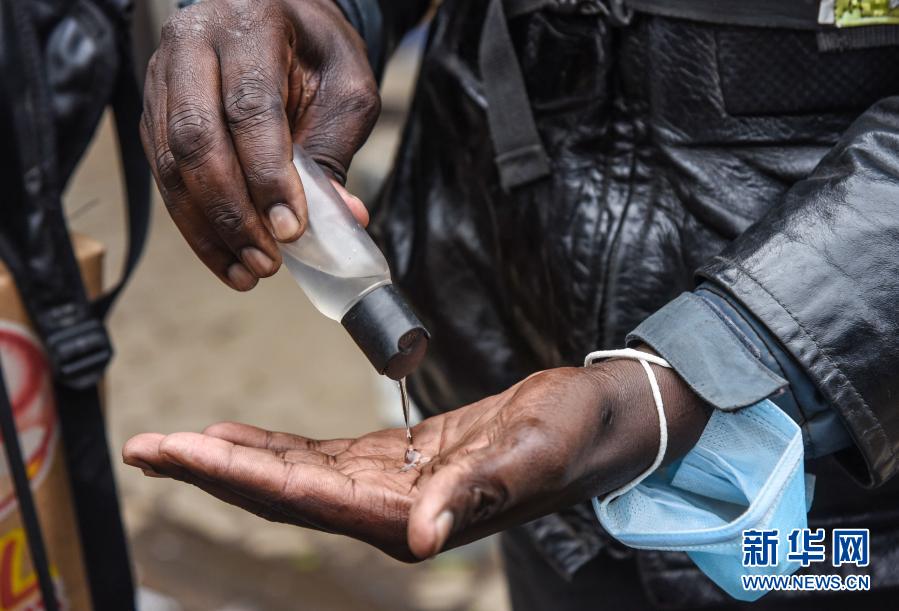 1月22日,摩西·奥蒂诺在肯尼亚首都内罗毕给手消毒。新华社发(约翰·奥科约摄)