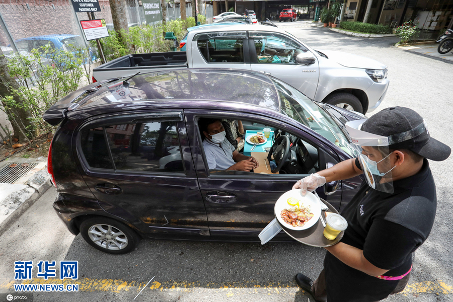 2月4日,马来西亚赛城,餐厅服务员们将餐食送到车上,顾客在车里用餐。(图片来源:东方IC)