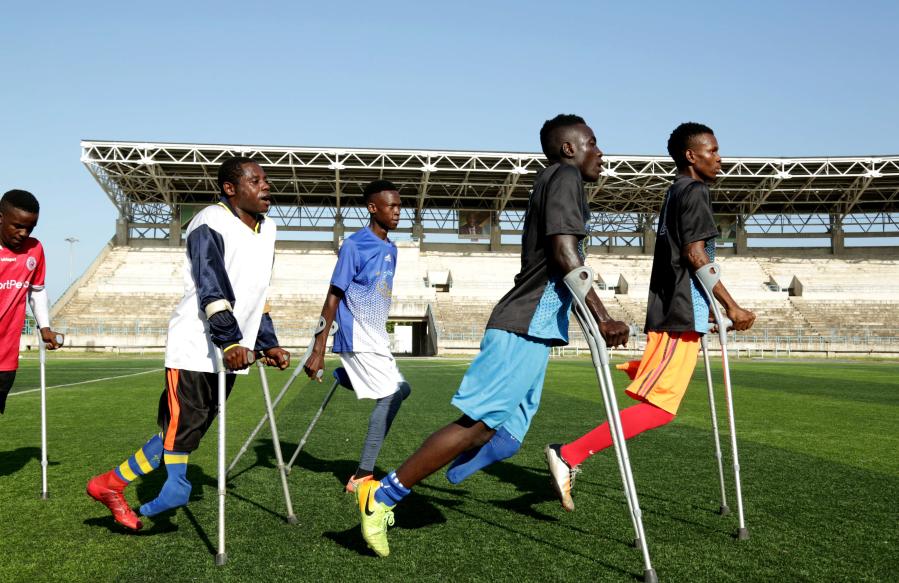 1月26日,坦桑尼亚截肢者足球队队员在位于达累斯萨拉姆的一个体育场内训练。新华社发