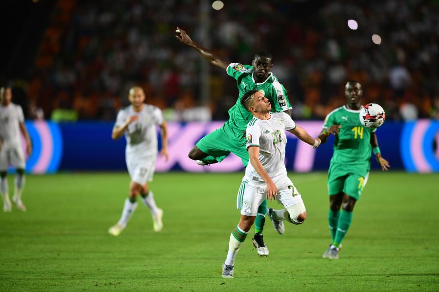 2019年7月19日,阿尔及利亚队球员贝纳塞(中前)在比赛中拼抢。新华社记者邬惠我摄