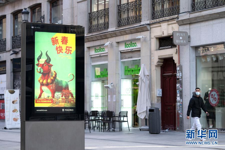 中国春节将至,马德里市政府专门设计的中国牛年吉祥海报在街头多处展示。