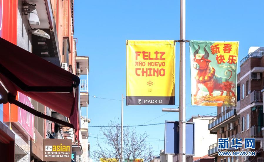 中国春节将至,马德里市政府专门设计的中国牛年吉祥海报在街头多处展示。