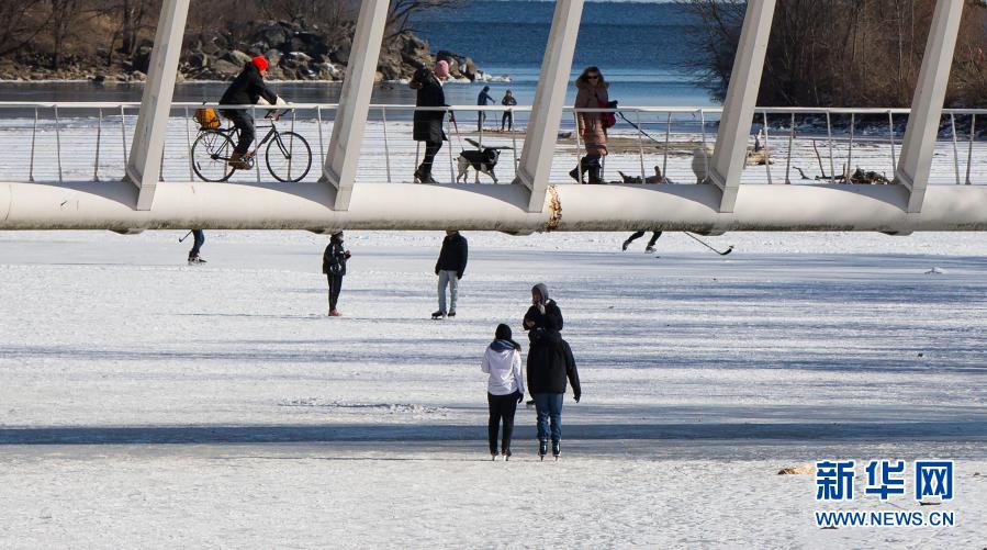 2月11日,在加拿大多伦多,人们在结冰的安大略湖面上滑冰。