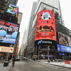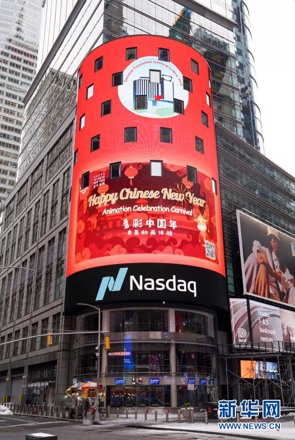 2月11日,在美国纽约,纳斯达克股票交易所巨型电子屏上播放中国春节传统文化短片。