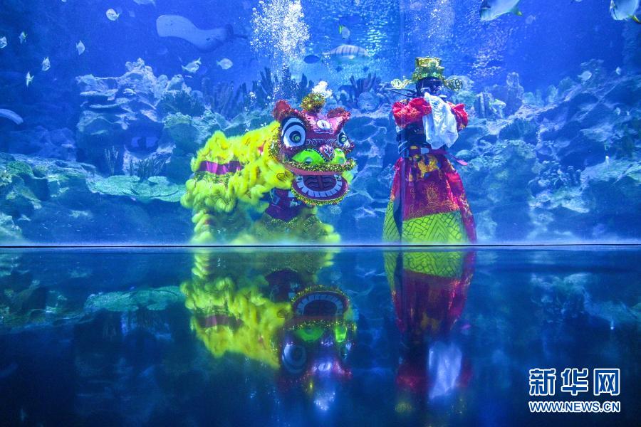 2月12日,马来西亚吉隆坡城中城水族馆的潜水员身着“财神”和“醒狮”服饰在水中表演。新华社发(张纹综 摄)