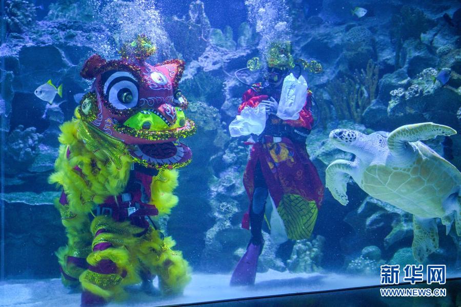 2月12日,马来西亚吉隆坡城中城水族馆的潜水员身着“财神”和“醒狮”服饰在水中表演。新华社发(张纹综 摄)