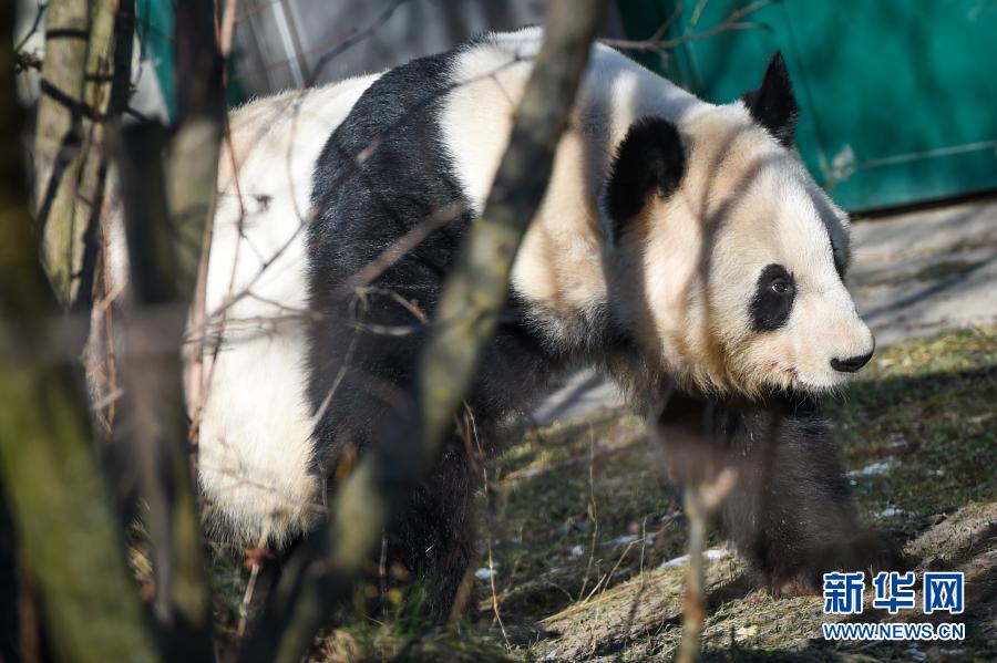 这是2月14日在奥地利维也纳美泉宫动物园拍摄的大熊猫“阳阳”。新华社记者 郭晨 摄