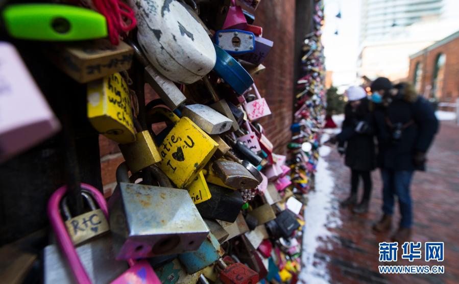 2月14日,在加拿大多伦多,人们观看挂在一个艺术装置上的同心锁。当天是西方情人节。新华社发(邹峥摄)