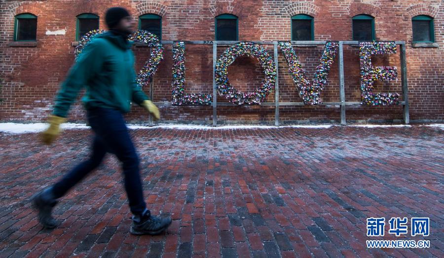 2月14日,在加拿大多伦多,一名男子从一个挂满同心锁的艺术装置前走过。当天是西方情人节。新华社发(邹峥摄)