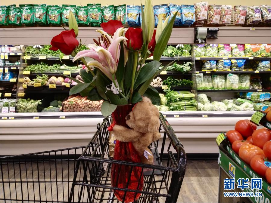 2月14日,美国加利福尼亚州圣马特奥一家超市的一辆购物车里放着一束鲜花。新华社记者 吴晓凌 摄