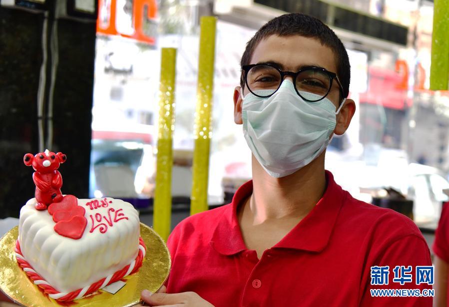 2月14日,一名甜点师在叙利亚首都大马士革展示为情人节准备的蛋糕。新华社发(阿马尔·萨法尔贾拉尼摄)