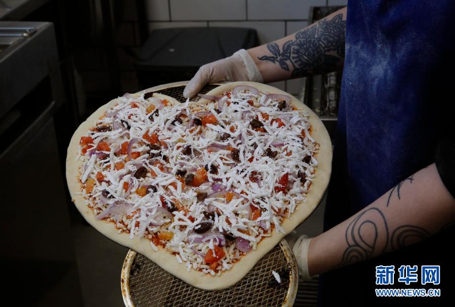 2月14日,在以色列特拉维夫,一家餐厅店员制作为情人节准备的心形披萨。新华社发(吉尔·科恩·马根 摄)