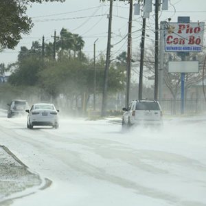 2月15日,在美国得克萨斯州休斯敦,车辆在积雪的道路上行驶。 受极地寒流影响,美国南部得克萨斯州部分地区14日夜间开始遭遇冬季风暴,造成路面结冰、道路被封以及大面积停电。 新华社发(劳承跃 摄)