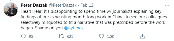 达萨克在菲舍尔的评论后回复道:“听听!我们花时间向记者解释了我们在中国长达一个月疲惫工作中的关键发现,而我们的同事所说的话却被断章取义,用来捏造在我们工作开始前就已设定好的报道,令人失望。《纽约时报》,你真无耻!”