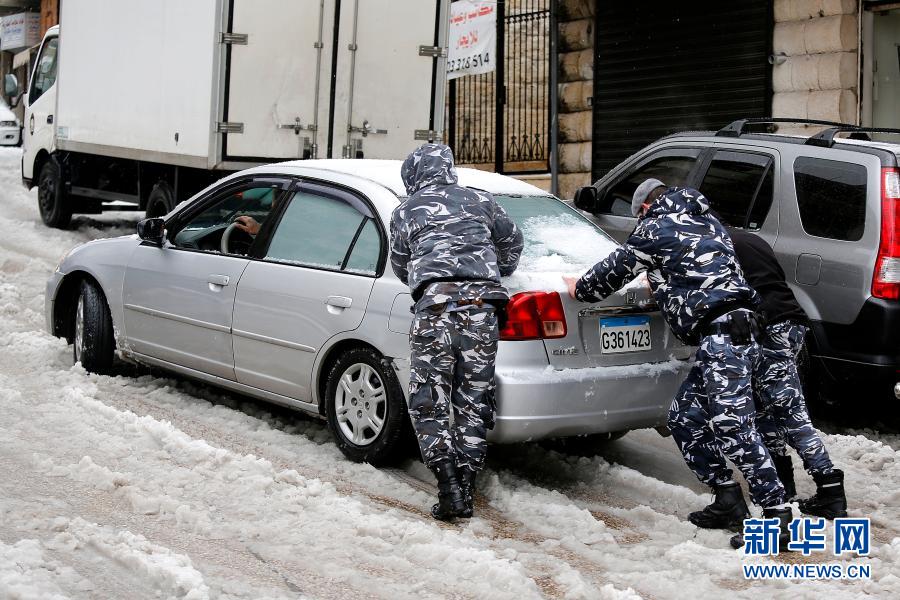 2月17日,在黎巴嫩黎巴嫩山省的阿莱村,警察帮忙推出雪地上的汽车。