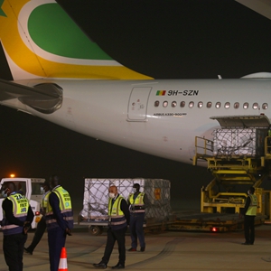 2月17日,在塞内加尔达喀尔布莱兹·迪亚涅国际机场,塞内加尔总统马基·萨勒(前)在接收中国国药集团新冠疫苗仪式上讲话。新华社记者 邢建桥 摄