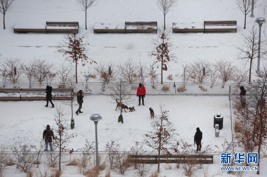 2月18日,人们在美国纽约一个积雪覆盖的公园内遛狗。