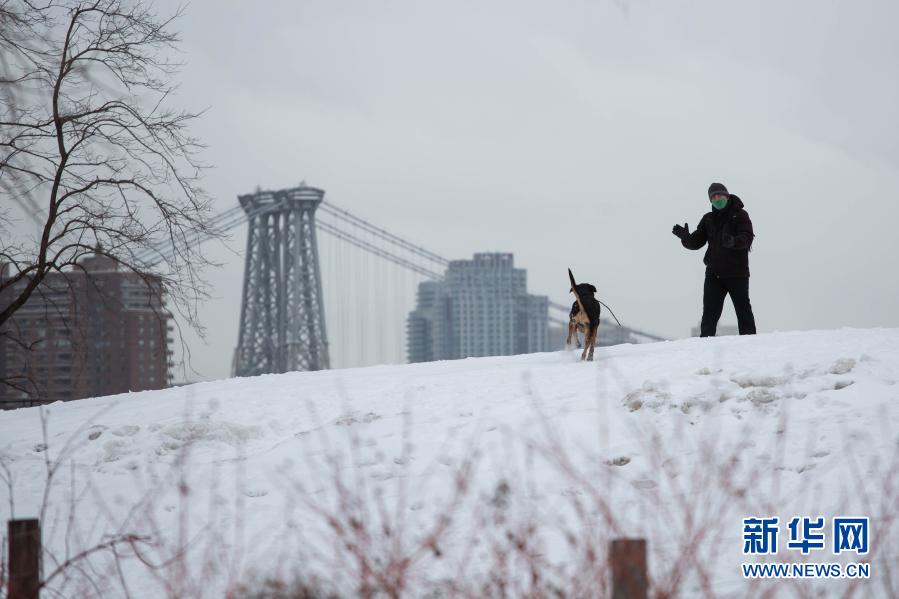 2月18日,在美国纽约,一名男子在雪中遛狗。