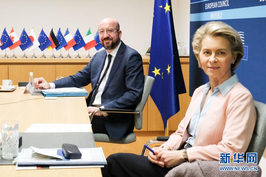 2月19日,在比利时布鲁塞尔的欧盟总部,欧洲理事会主席米歇尔(左)和欧盟委员会主席冯德莱恩出席七国集团领导人视频会议。