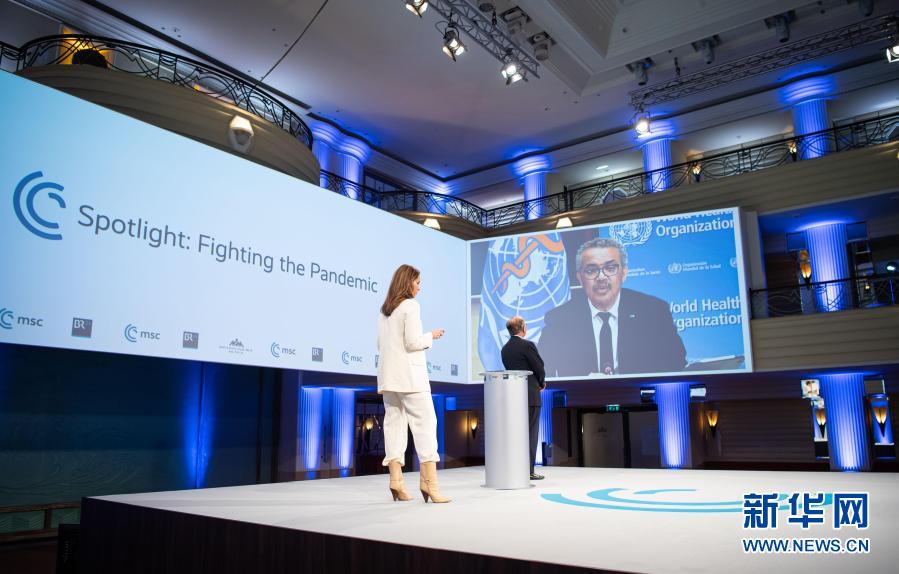 这是2月19日在德国慕尼黑拍摄的世界卫生组织总干事谭德塞通过视频出席慕尼黑安全会议线上特别会议的画面。