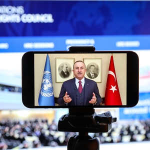 这是2月22日在比利时布鲁塞尔拍摄的土耳其外交部长恰武什奥卢在联合国人权理事会第46届会议高级别会议上致辞的屏幕画面(背景为联合国人权理事会官方网站画面)。