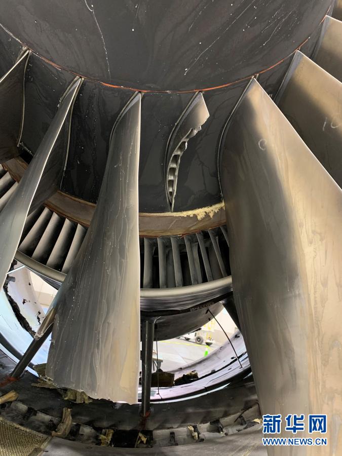 这是出现发动机故障的美国联合航空公司波音777-200客机右发动机受损风扇叶片(2月22日摄)。