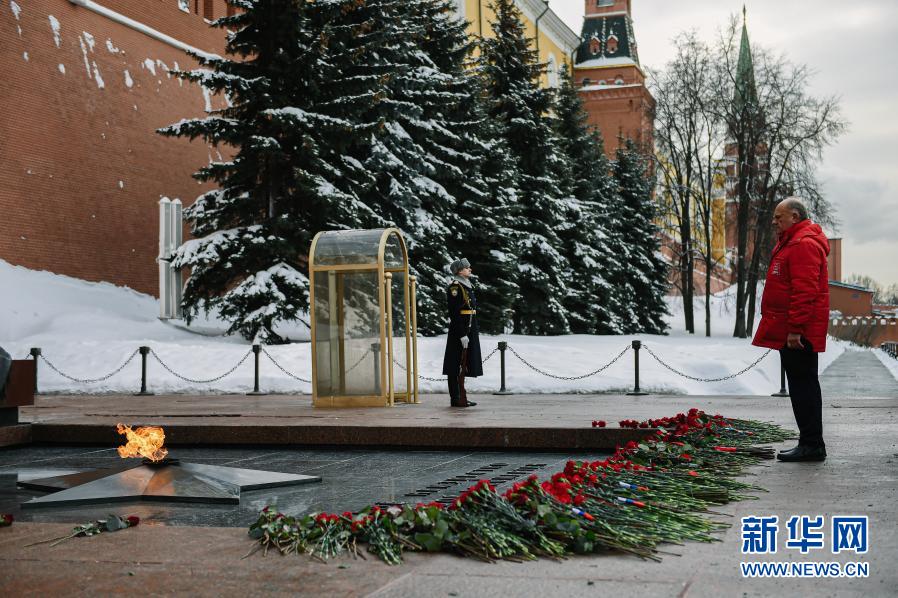 2月23日,在俄罗斯首都莫斯科,俄罗斯联邦共产党中央委员会主席久加诺夫向无名烈士墓献花,纪念祖国保卫者日。