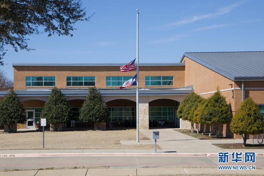 2月24日,美国得克萨斯州达拉斯市北郊一所学校门口的美国国旗和得克萨斯州旗降半旗悼念新冠逝者。新华社发(田丹摄)