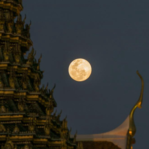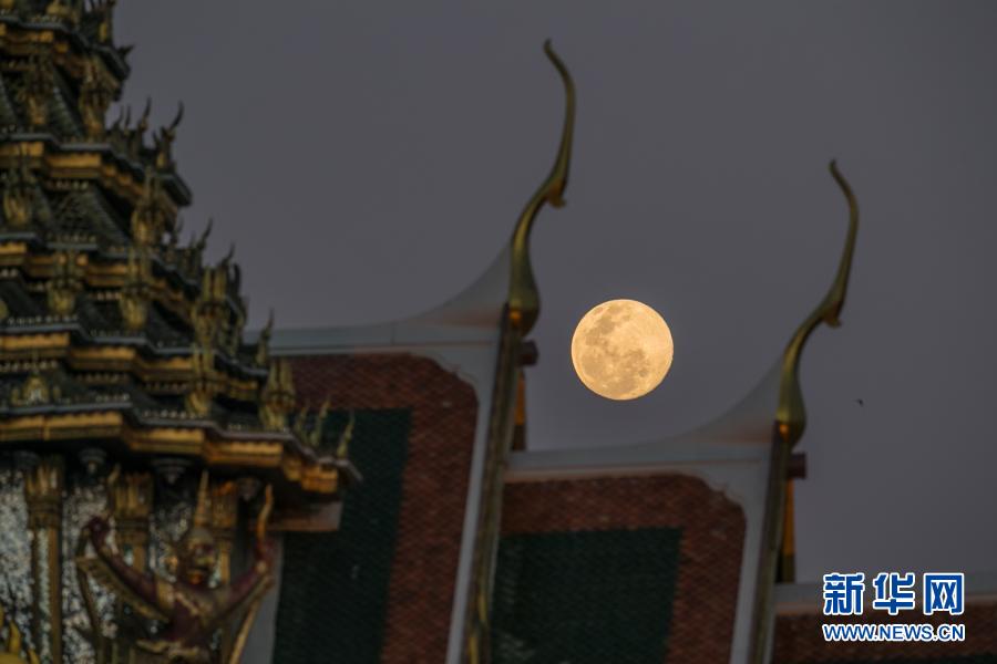 2月26日,一轮圆月从泰国曼谷大王宫建筑群背后升起。新华社记者 张可任 摄