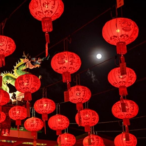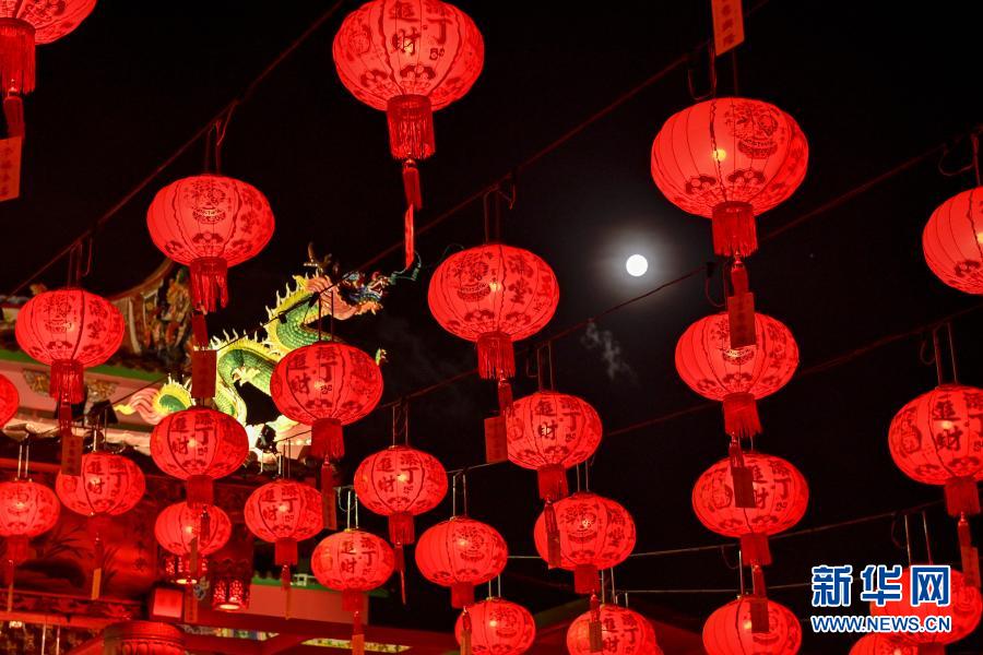 这是2月26日在马来西亚吉隆坡拍摄的大红灯笼映衬下的元宵节圆月。