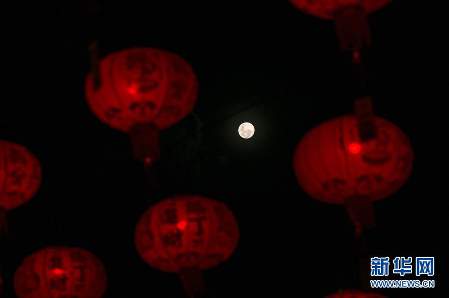 这是2月26日在马来西亚吉隆坡拍摄的大红灯笼映衬下的元宵节圆月。
