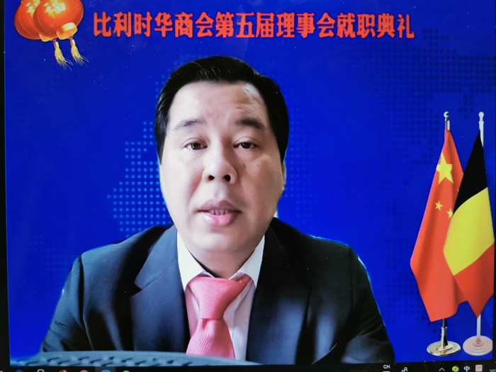2021年2月25日,比利时华商会新任会长孙策出席华商会第五届理事会“云端”就职仪式 (记者 潘革平 摄)