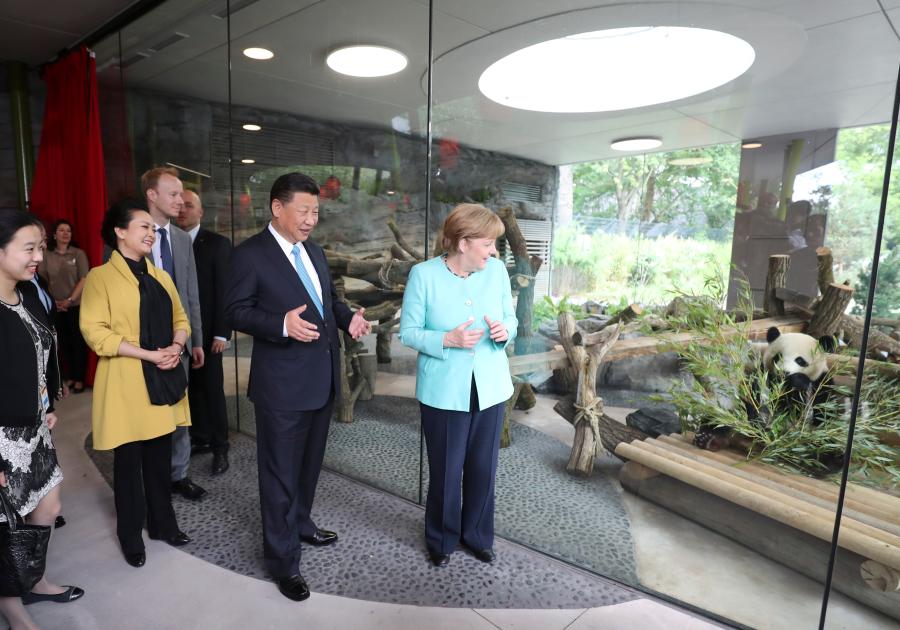 2017年7月5日,国家主席习近平同德国总理默克尔共同出席柏林动物园大熊猫馆开馆仪式。