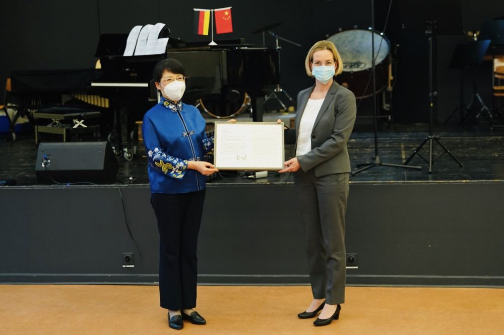 彭丽媛近期亲切致信该校师生,勉励他们为增进中德人民友谊作出新贡献。当天的转交活动上,两名学生代表朗读了中文信件和德语译文。师生代表请驻德大使馆转交给彭丽媛教授的回信。同学们还与中德来宾分享交流了中文学习和赴华游学的经历感想。
