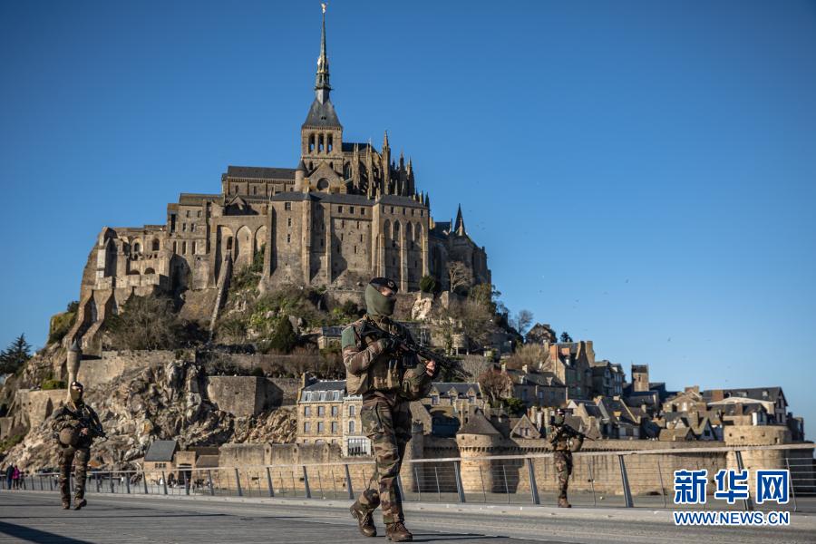 2月27日,军人在法国西部的著名景点圣米歇尔山附近值勤。