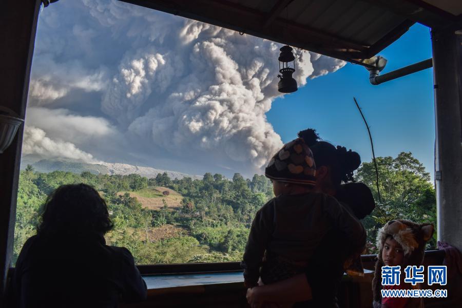 3月2日,人们在印度尼西亚北苏门答腊省卡罗观看喷发的锡纳朋火山。新华社发(森比林摄)