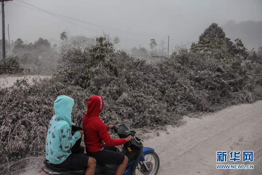 3月2日,印度尼西亚北苏门答腊省卡罗的居民行驶在火山灰覆盖的道路上。