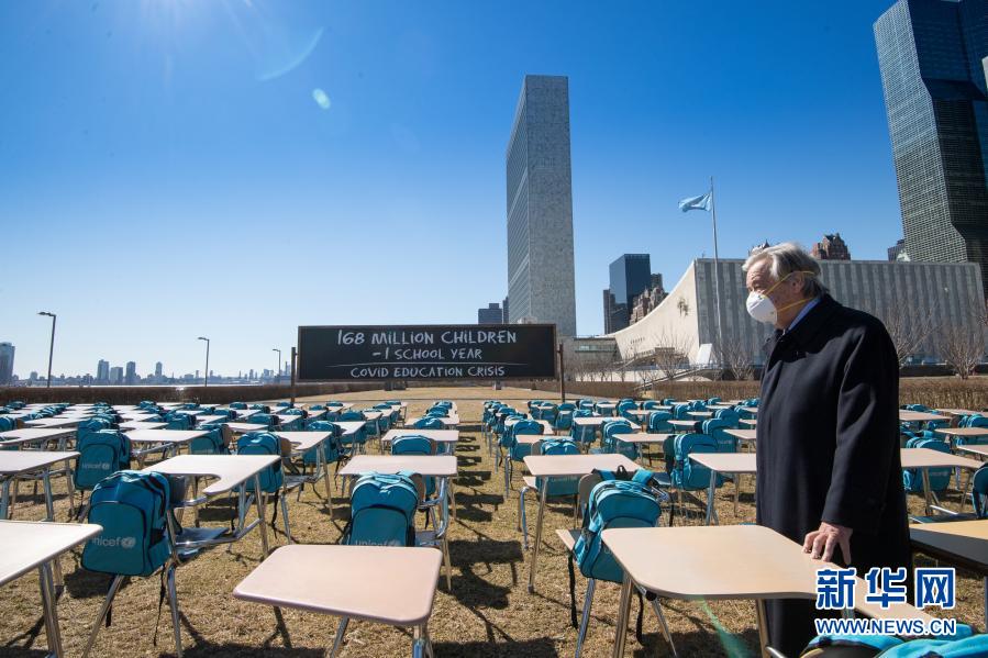 3月2日,联合国秘书长古特雷斯在纽约联合国总部出席“疫情中的教室”项目揭幕仪式,呼吁各国政府重视重新开放学校的必要性。新华社发(联合国供图/埃瑟金德尔·德贝贝摄)